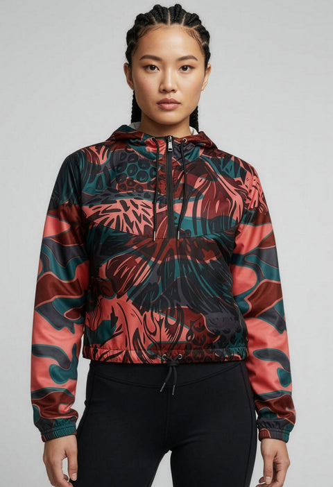 Lightweight, expressive, and built for movement, the Bova Cropped Half-Zip Windbreaker brings bold design into an effortless outer layer. The cropped silhouette adds edge, while the water-resistant shell and breathable mesh lining keep things comfortable no matter where the day takes you. Finished with custom artwork and adjustable details, this piece is designed to stand out without sacrificing ease.