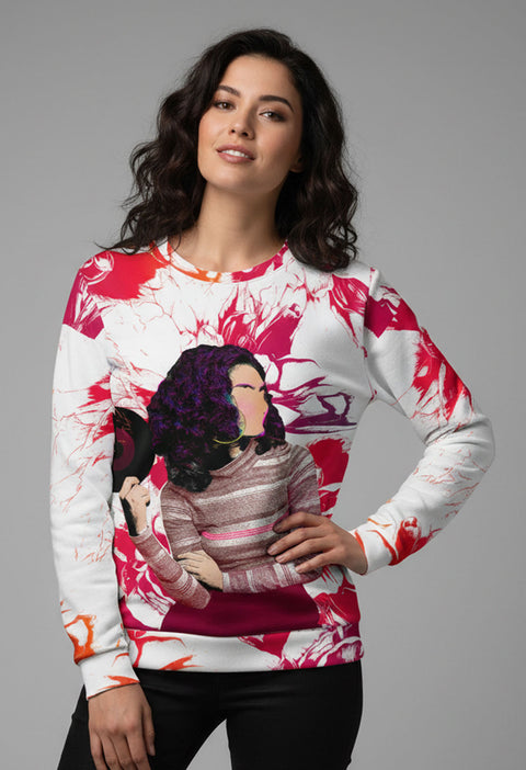 The exterior showcases a striking collage of color and texture—an editorial-inspired fusion that celebrates individuality and rhythm. Inside, a brushed fleece lining delivers warmth and cloud-soft comfort, making it the perfect sweatshirt for slow-jam nights, creative days, or anytime you want to look effortlessly unforgettable.
