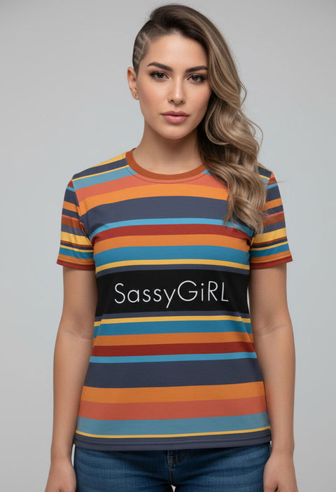 Bring bold personality into your rotation with the Sania Marie SassyGiRL Top — a clean, striped statement piece with effortless edge. The multicolor bands create a retro-modern rhythm, centered by a sharp black panel that highlights the SassyGiRL message with confidence. Crafted from a premium knit mid-weight jersey, it delivers a smooth cotton-touch feel, a relaxed fit, and everyday comfort without losing shape or vibrancy. Pair it with denim, leggings, or a mini skirt and let the energy do the talking.