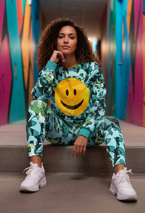 The bold camo-inspired pattern is energized by the oversized smiley graphic—striking, playful, and full of attitude. Whether you’re chilling at home, heading out with friends, or styling a head-to-toe look with the matching joggers, this piece brings effortless cool to any moment.